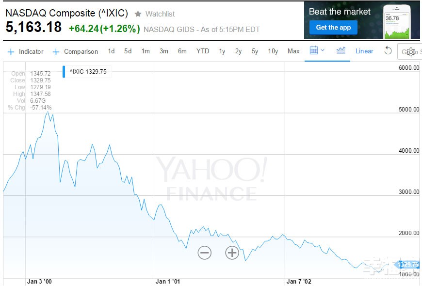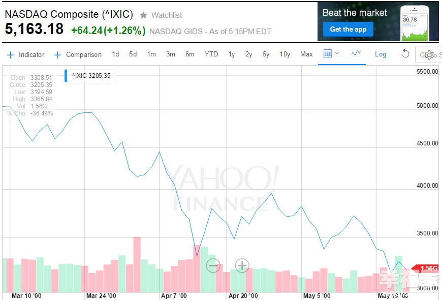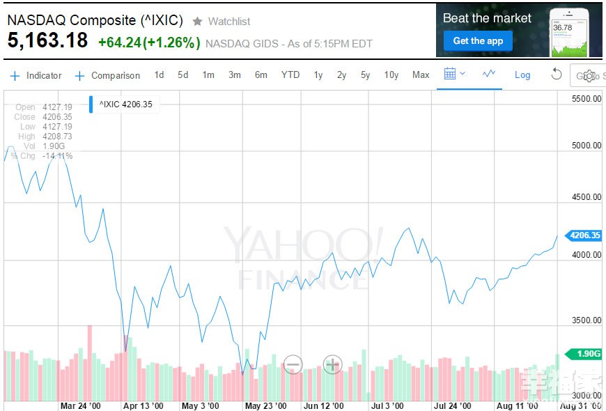 中国A股市场刚刚经历了一次让很多人终身难忘的下跌,创业板从6月8日开始调整,上证指数在6月15日也加入调整,不断的下跌导致融资配资盘被强制平仓,又加剧了下跌走势。进入七月后,市场的恐慌情绪逼迫国家出手救市,在不断强化的救市措施下,创业板7月8日率先反弹,短短22个交易日,创业板下跌了43%,上证指数18个交易日下跌了35%。 具有对照意义的是2000年3月NASDAQ科技股的泡沫破裂,从3月10日开始的25个交易日里NASDAQ指数下跌了34%,可见中国这次股灾的强度甚至超过了美国那次。之后的行情如何演绎,看看NASDAQ的历史走势应该会有参考意义。 Nasdaq市场2000年3月10日-2000年5月26日走势图 Nasdaq市场2000年3月9日-2000年9月1日走势图 Nasdaq市场1999年11月-2002年11月走势图 Nasdaq市场2015年完整走势图 |