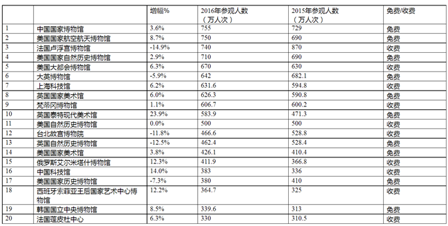 2017年6月5日,英国著名全国性综合日报《卫报》发布题为《伦敦和华盛顿占据了世界博物馆排名前列》的新闻。该新闻根据《2016 TEA/AECOM主题公园指数和博物馆指数报告》,指出全球前20家人气指数最高的博物馆排名中,中国国家博物馆以755万参观人数位居世界第一。 《卫报》新闻中提到的《主题公园指数和博物馆指数报告》,是由美国主题景点协会(TEA)和国际专业技术与管理咨询服务提供商AECOM的经济部门合作撰写的年度报告。根据该报告历年统计数据显示,中国国家博物馆的文化影响力和观众吸引力连续三年持续快速增长。2014年被评为世界最受欢迎的博物馆,位居第三,2015年上升为第二,仅排在法国卢浮宫博物馆之后,2016年以755万参观人数位居第一,成为全世界人气最旺、最受欢迎的博物馆。 全球前20家最受观众欢迎的博物馆中,中国国家博物馆位居第一,美国国家航空航天博物馆位居第二,法国卢浮宫博物馆位居第三,美国国家自然历史博物馆位居第四,美国大都会博物馆位居第五,大英博物馆位居第六。 |